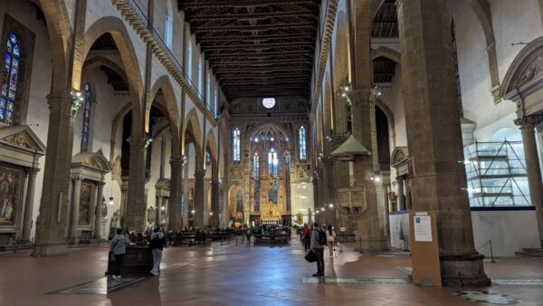 The Basilica di Santa Croce is a masterpiece of Italian Gothic architecture, renowned for its stunning façade and intricate details that showcase centuries of craftsmanship. It houses the tombs of illustrious figures such as Michelangelo, Galileo Galilei, Machiavelli, and Dante and includes a vast array of priceless artworks, including frescoes by Giotto and Donatello’s striking crucifix, offering a profound glimpse into the Renaissance art movement. The church is a quiet place to spend an hour or two, away from the hubbub of the busy city streets. When we were there, it was also a safe haven from an insane hail storm!